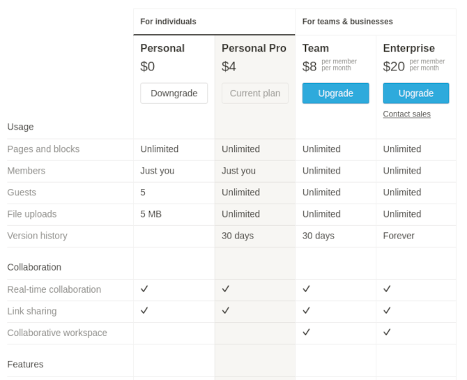 بیشتر امکانات قابل استفاده در Notion رایگان است