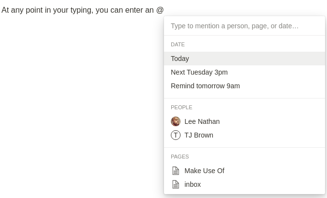 در زمانی که در حال نوشتن متن در Notion هستید، برای ایجاد ارجاعات آسان به صفحات ، افراد و تاریخها ، میتوانید از نماد "@" استفاده کنید.