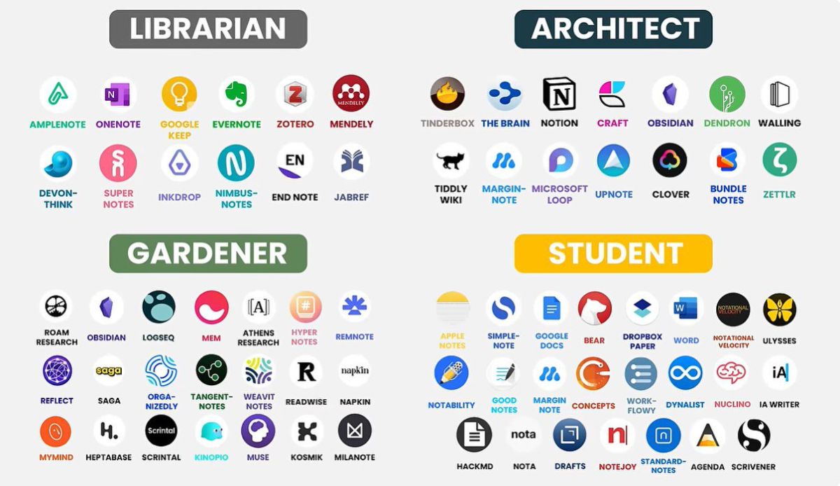 برای آشنایی دقیقتر با نرمافزارهای مناسب هر تیپ شخصیتی، تصویر زیر که توسط Tiago Forte منتشر شده است، میتواند راهنمایی کاربردی باشد. این تصویر نمای کاملی از اپلیکیشنهای محبوب برای هر گروه، شامل معمار، باغبان، کتابدار و دانشجو ارائه میدهد. اگر هنوز مطمئن نیستید کدام تیپ به شما نزدیکتر است، با بررسی این دستهبندی، انتخاب مناسبتری خواهید داشت.