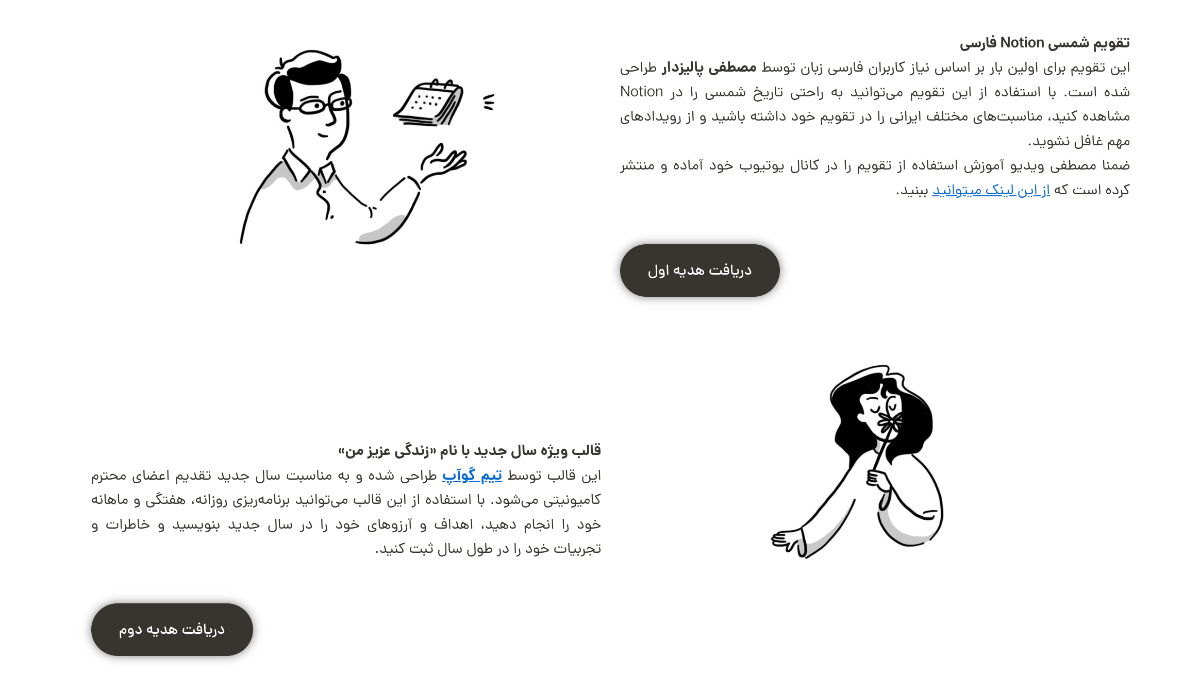 تقویم شمسی در Notion یکی از مهمترین نیازهای این ابزار برای کاربران ایرانی بود، که برای اولین بار به عنوان اولین محصول رایگان کامیونیتی طراحی و به عنوان یکی از هدایای نوروزی به اعضای کامیونیتی اهدا شده است که با استفاده از این تقویم میتوانید به راحتی تاریخ شمسی را در Notion مشاهده کنید، مناسبتهای مختلف ایرانی را در تقویم خود داشته باشید و از رویدادهای مهم غافل نشوید.