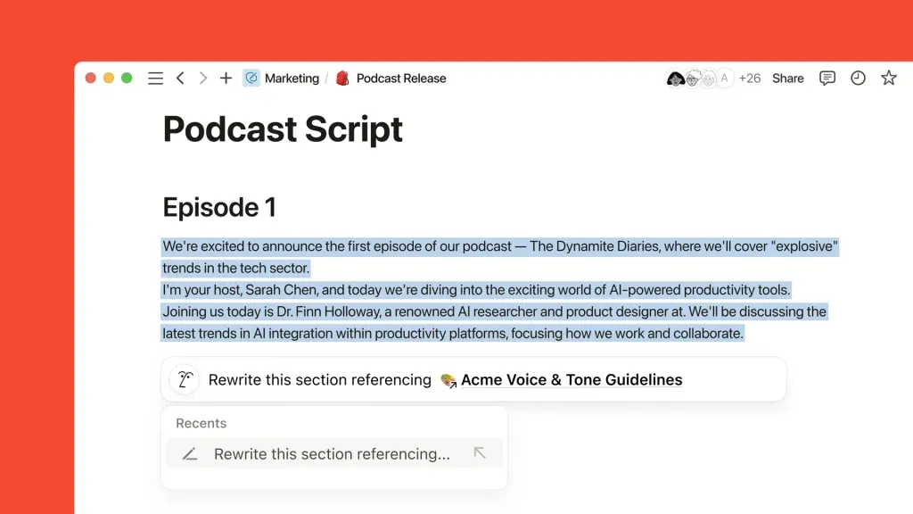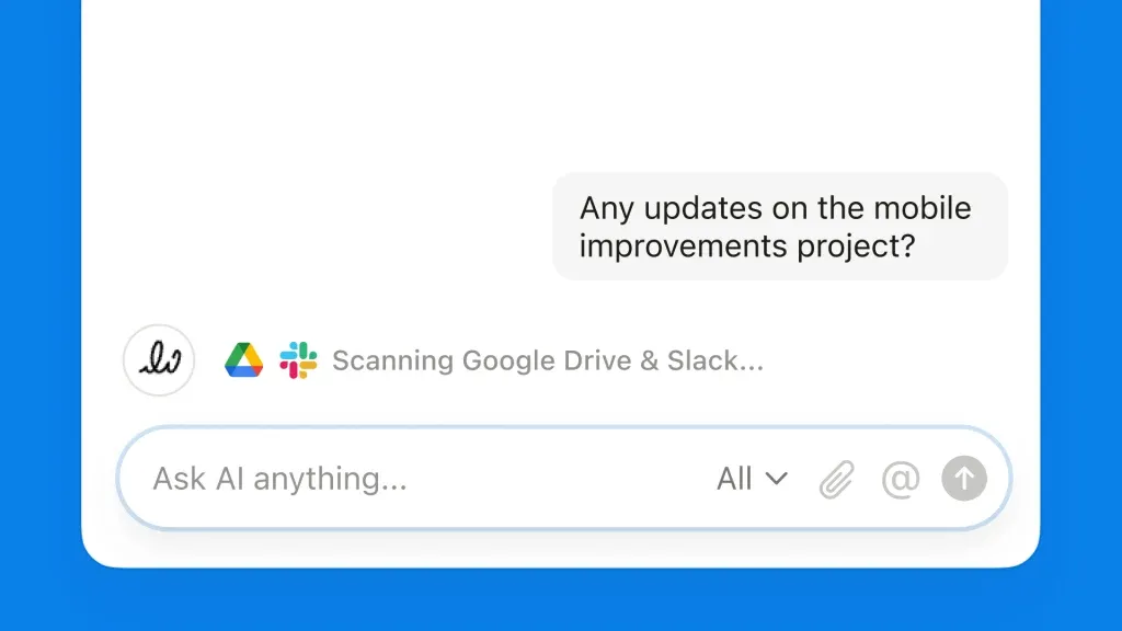حضور همهجای Notion AI در سراسر اپلیکیشن Notion به تجربه شخصیت میده، ولی هدف اصلیش اینه که ابزارهای مختلف UI شرکت رو که میتونن یه سند رو به سبک خودت تولید کنن یا کل فضای کاریت رو برای یه قطعه اطلاعات جستجو کنن، یکپارچه کنه. "تقریباً حس میشه که بخشی از نشانگر ماوسته"، لی میگه. "هر صفحهای رو نگاه میکنی، هر جا که تمرکز داری، AI هم بهش توجه میکنه."