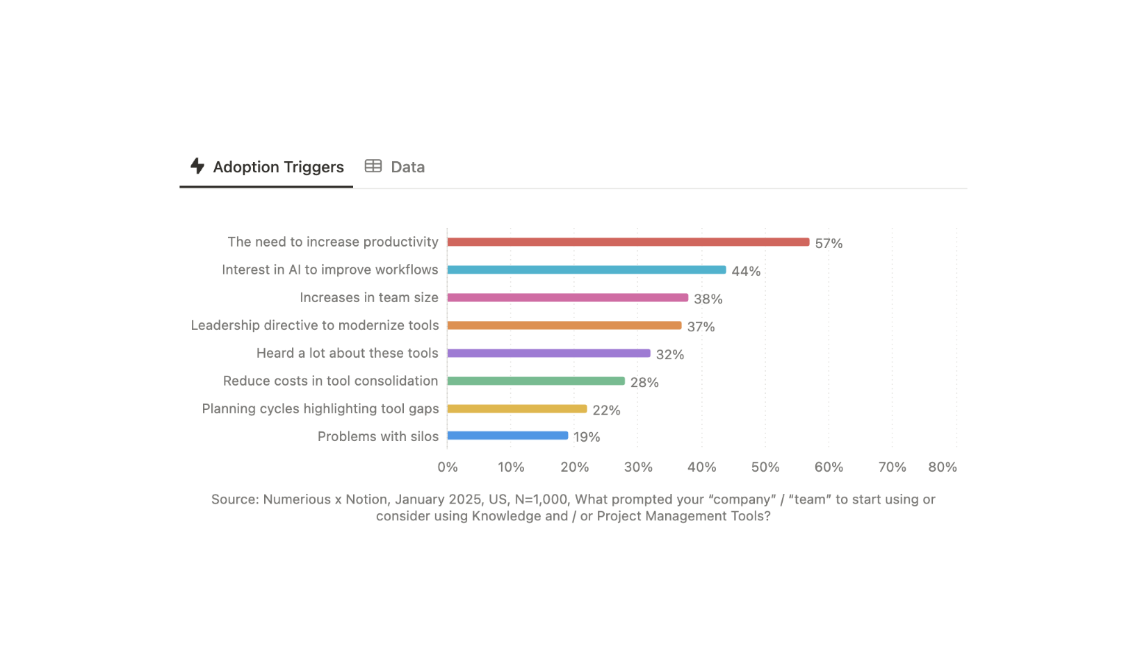 ۵۷ درصد از تصمیمگیرندگان گفتند که بهبود بهرهوری تیم انگیزه اصلی آنها بوده، در حالی که ۴۴ درصد به طور خاص به هوش مصنوعی به عنوان محرکی برای ارزیابی پلتفرمهای جدید اشاره کردند.