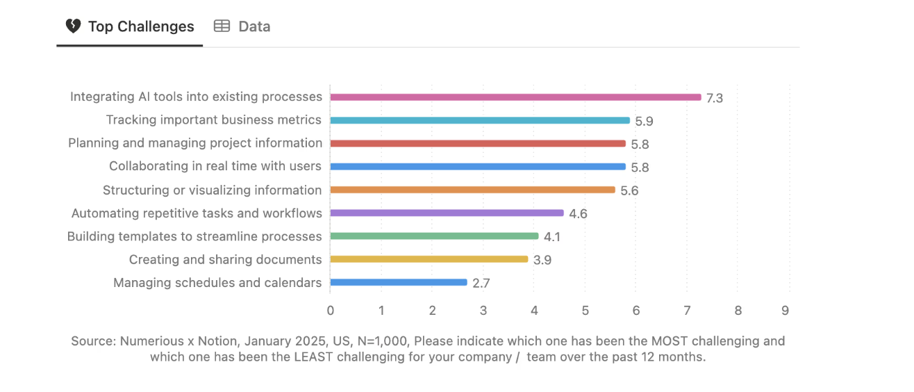 همه به دنبال استفاده از هوش مصنوعی هستند، اما عملی کردن آن چالشبرانگیز است. برای بسیاری از شرکتها، این یک چالش پیادهسازی است. کار در ابزارهای متعددی جریان دارد و ادغام هوش مصنوعی در این سیستمهای جداگانه تقریباً غیرممکن است. ما اخیراً از هزار متخصص مسئول تصمیمگیری درباره نرمافزارهای بهرهوری نظرسنجی کردیم و در حالی که آنها برای هماهنگ کردن ابزارهایشان با یکدیگر مشکل دارند، به شدت مشتاق هستند که هوش مصنوعی را در جریان کارهای خود وارد کنند.