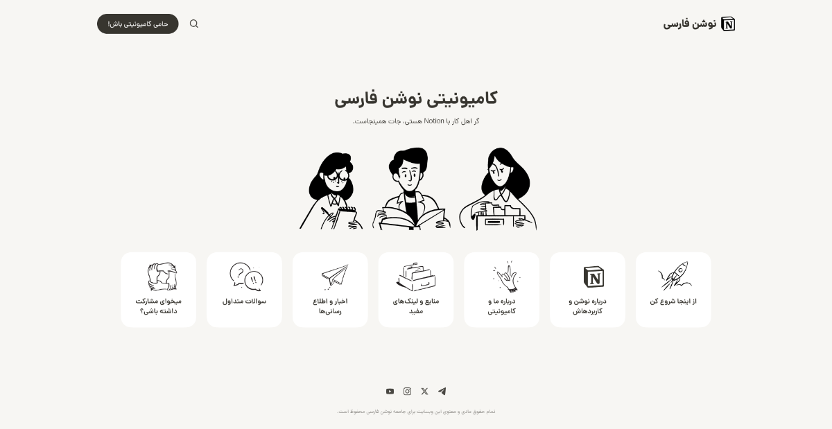 کامیونیتی نوشن فارسی از پاییز ۱۴۰۲ با هدف گفتگو و تبادل تجربیات کاربران نوشن فارسی زبان، انتشار اخبار و آخرین تغییرات Notion و معرفی منابع رایگان و… تشکیل شده که از این لینک میتوانید اطلاعات بیشتری کسبکنید و رایگان عضو کامیونیتی شوید